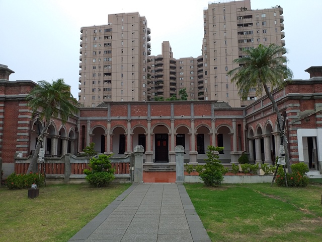 ▲呈ㄇ字型的閩南式土角厝,正立面融合日本近代洋樓洗石子拱圈柱廊,左右側為清水磚牌樓,其高度比屋頂高