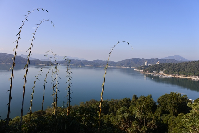 ▲望向潭面,以拉魯島為界,東北方形較寬闊似日輪;西南方較狹長如月鉤,即可明白日月潭名稱的由來。