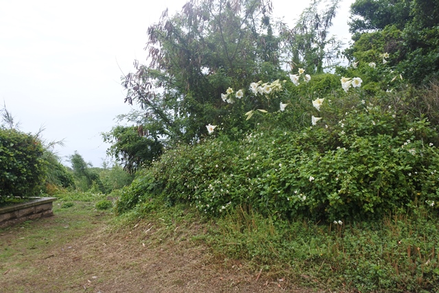 ▲在公園入口處有一叢盛開的野百合 (其右,為大榕樹,再過去紅磚建物為東莒派出所)